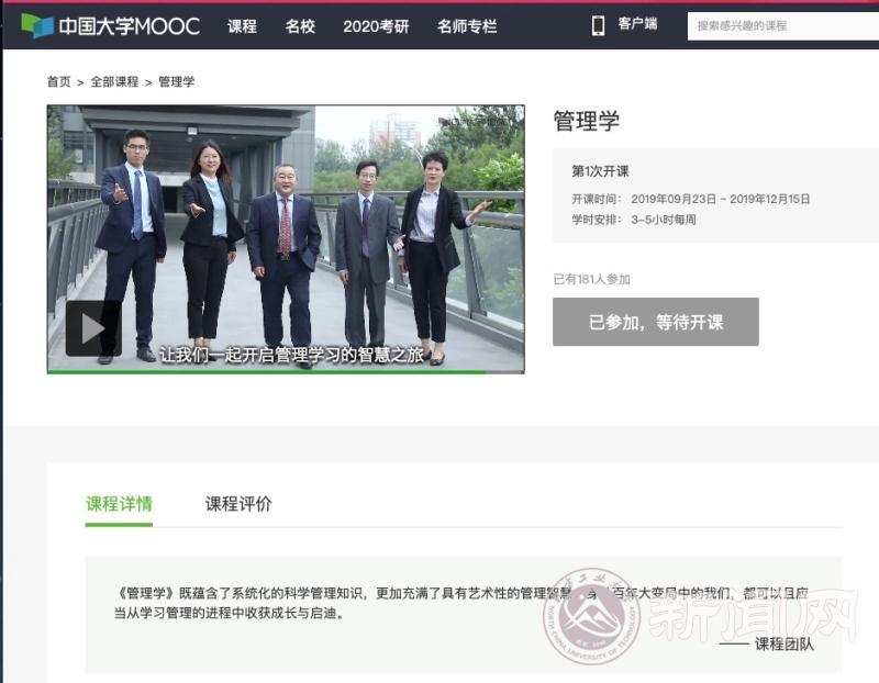 近日,伟德官网《管理学》课程在“中国大学MOOC”平台成功上线,该课程将于9月23日正式开课,是伟德官网首次在国内主流MOOC平台上线管理类的相关MOOC课程。该课程由北京市教学名师、经济管理学院院长赵继新教授任课程负责人,郑强国、魏秀丽、罗文豪、张淑谦四位老师任成员。
