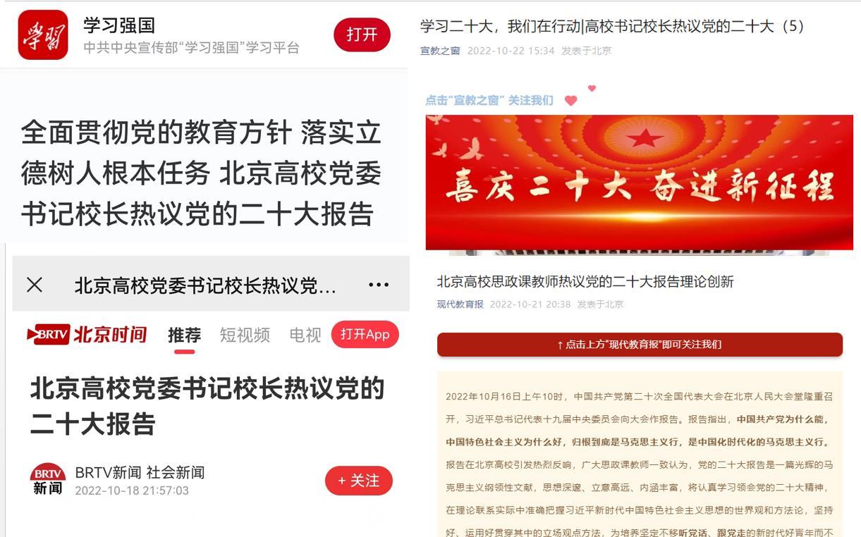“现代教育报”平台在“北京高校思政课教师热议党的二十大报告理论创新”专题中刊载了马克思主义学院党委书记张茂林学习党的二十大报告的理论认识。“现代教育报”平台在“北京高校师生畅谈科教兴国战略”专题中刊载了土木学院教授孙世国、信息学院教授王彦平结合自身教学和科研情况所谈的学习感想。“北京教育融媒体中心”刊载了经济管理学院学生冯慧颖观看党的二十大开幕会的学习心得体会。