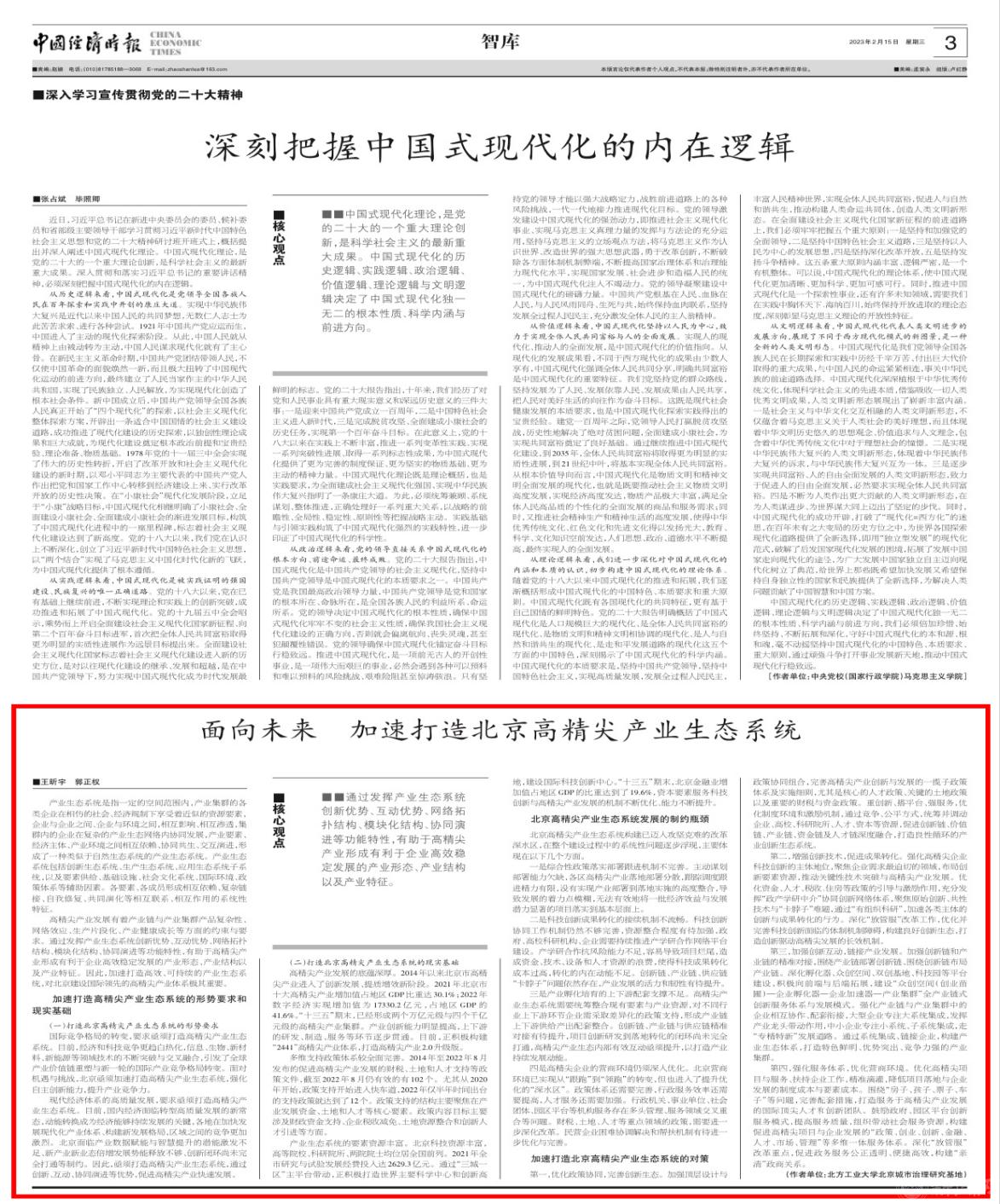 2月15日,《中国经济时报》“智库”栏目刊发伟德官网经济管理学院王昕宇副教授、郭正权教授的理论文章《面向未来 加速打造北京高精尖产业生态系统》。该文章依托伟德官网北京城市治理研究基地,在对北京高精尖产业发展深入研究的基础上,指出通过发挥产业生态系统创新优势、互动优势、网络拓扑结构、模块化结构、协同演进等功能特性,有助于高精尖产业形成有利于企业高效稳定发展的产业形态、产业结构以及产业特征,并就加速打造北京高精尖产业生态系统提出相应政策建议。