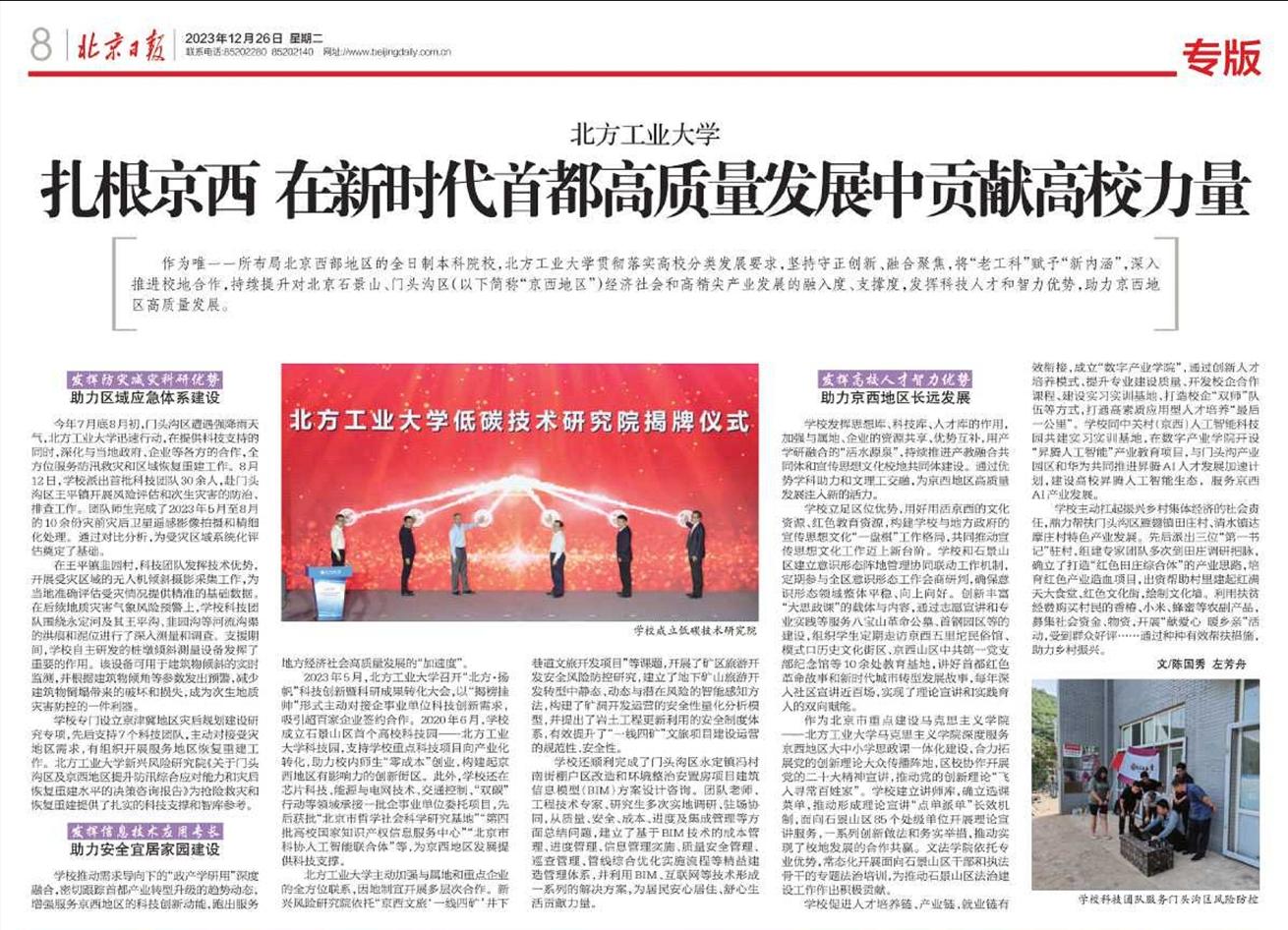 12月26日,《北京日报》第8版(专版)以《扎根京西 在新时代首都高质量发展中贡献高校力量》为题,深入报道伟德官网立足高水平应用型大学定位,扎根京西,发挥科研优势、技术优势和人才智力优势,助推新时代首都高质量发展的经验做法。