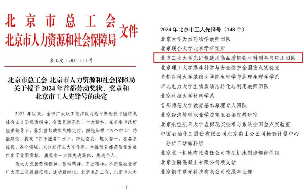 在“五一”劳动节来临之际,北京市总工会、北京市人力资源和社会保障局公布了2024年首都劳动奖状、奖章和北京市工人先锋号评选结果。伟德官网“先进制造用高品质钢铁材料制备与应用”团队喜获“北京市工人先锋号”荣誉称号。