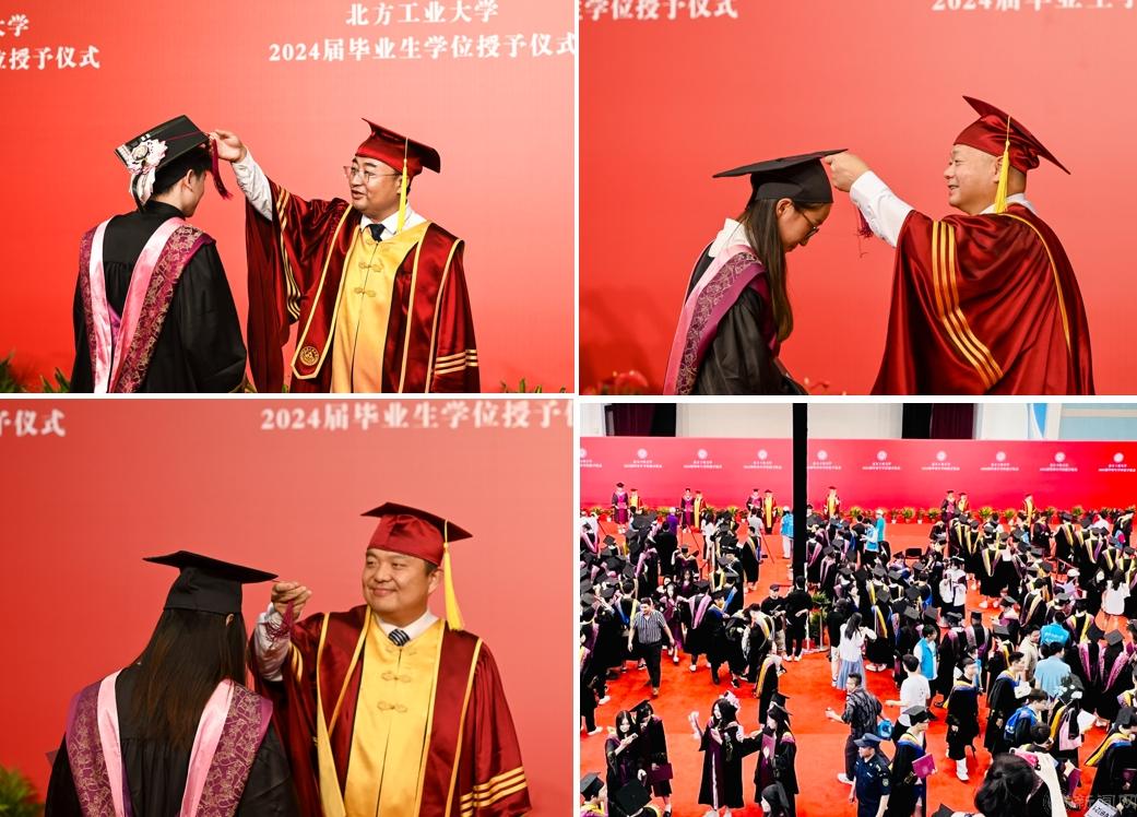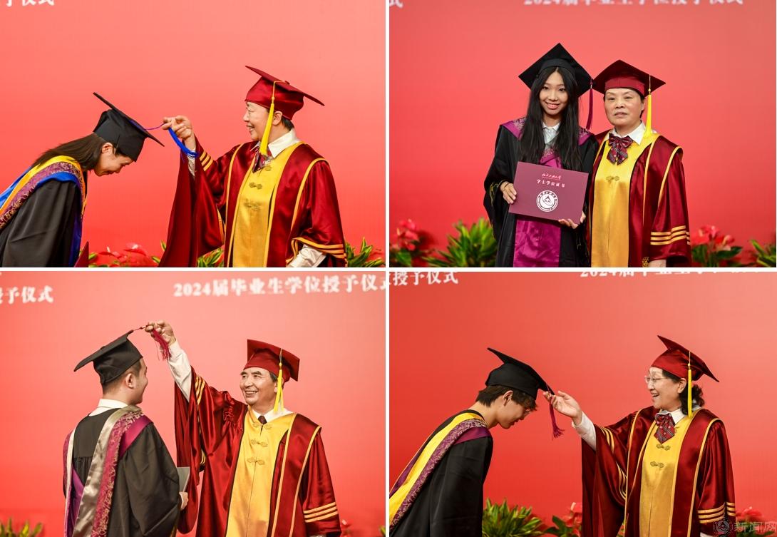 随后,学位授予仪式在体育馆二层举行,校领导、学院领导及学位委员会委员为毕业生们一一拨正流苏。