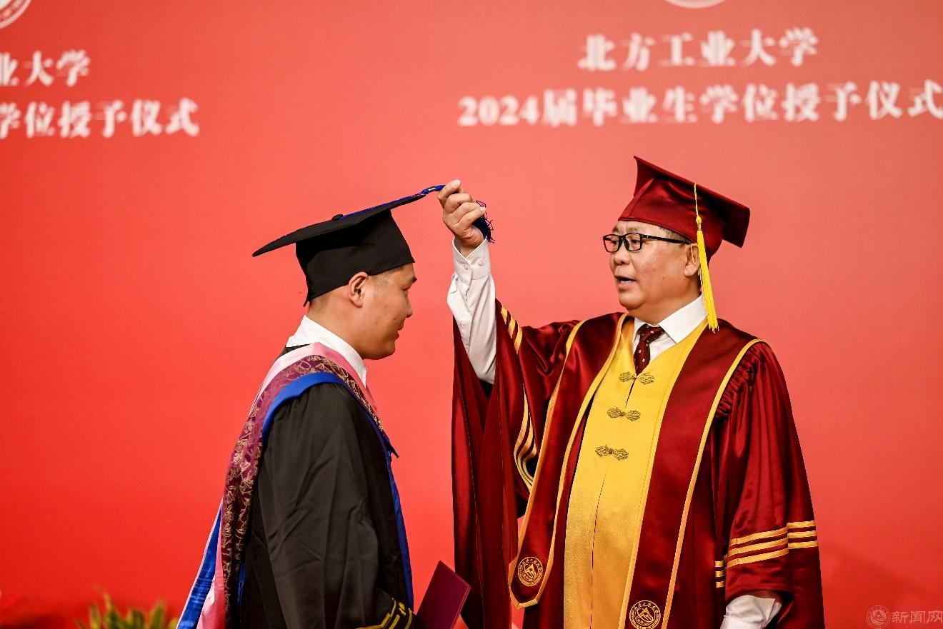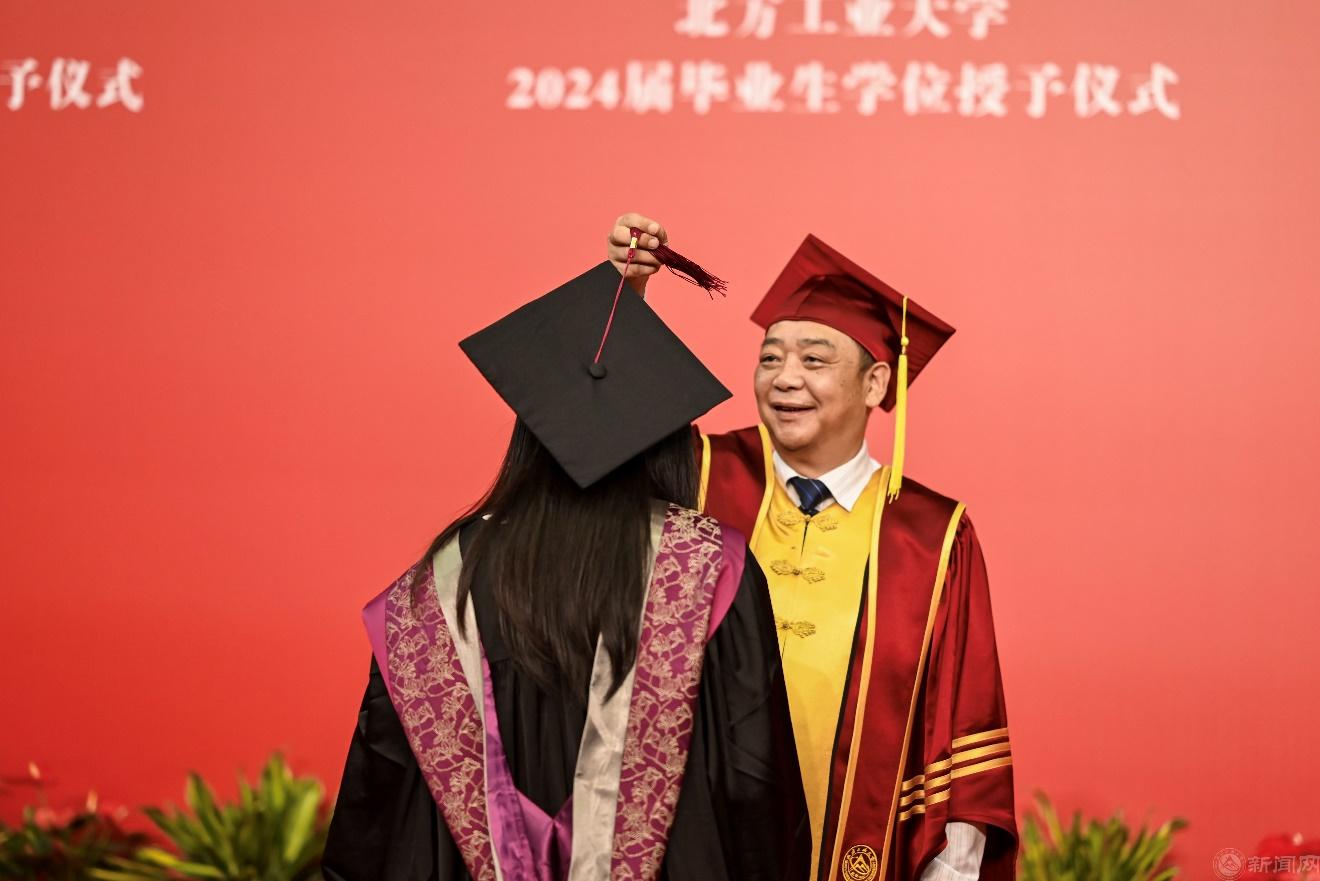 党委副书记、校长张立峰致辞。他祝贺2024届学生顺利完成学业,并现场做一次特殊的“点名”,向典礼当天生日的12名同学送上真挚的祝福。他表示,北方工大是同学们筑梦远航的起点、收获同学情谊的圣地,“青春工大”将成为大家人生中意义非凡的难忘经历。张立峰与师生共同回顾四年难忘的校园生活,赞扬同学们面对疫情肆虐时的挺膺担当、完成学业时的刻苦钻研、开展科学研究时的拼搏进取、投身“四大节”全面成长成才的激情绽放、面对挫折困难时的迎难而上,他动情地点出在各个领域表现优异的学生名字,将赞美和掌声送给他们,让同学们带着骄傲和荣耀告别母校。