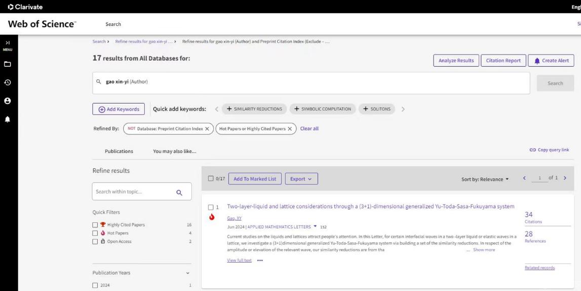 近日,伟德官网理学院教师高心怡在Applied Mathematics Letters(应用数学快报)发表的标题为Two-layer-liquid and lattice considerations through a (3+1)-dimensional generalized Yu-Toda-Sasa-Fukuyama system[通过(3+1)维广义Yu-Toda-Sasa-Fukuyama系统考察双层液体和晶格]的文章入选“ESI热点论文”。