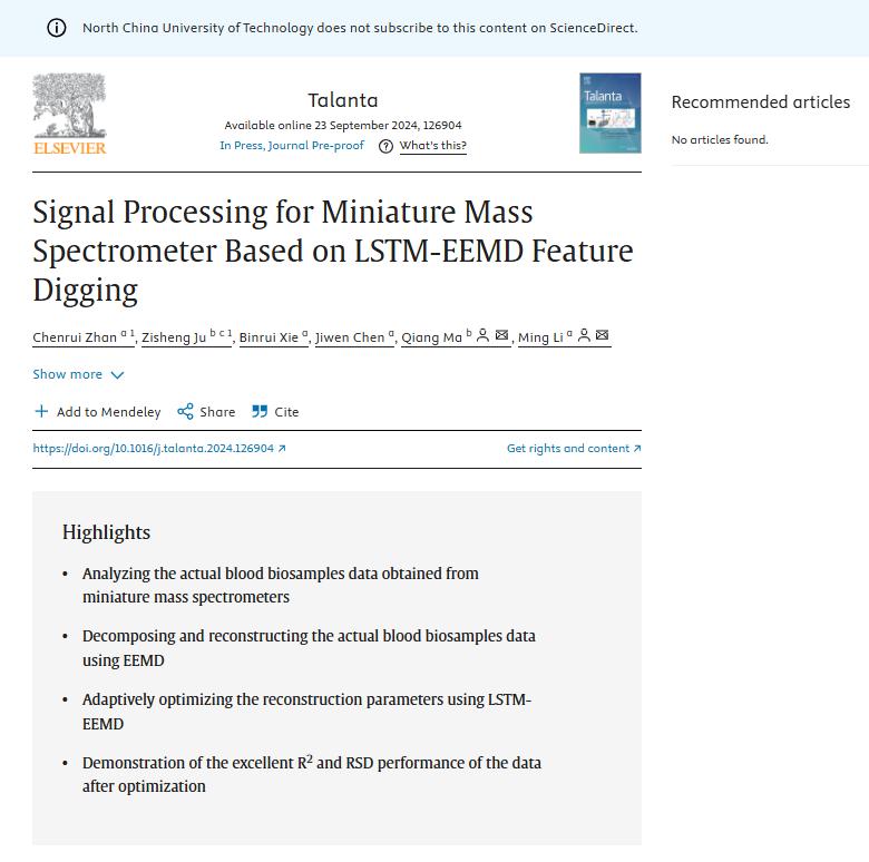 近期,伟德官网电控学院李明研究员在国际顶级期刊《Talanta》(中科院一区、TOP期刊)发表题为“Signal Processing for Miniature Mass Spectrometer Based on LSTM-EEMD Feature Digging”的研究论文。该研究创造性地提出了一种基于长短期记忆-集合经验模态分解(LSTM-EEMD)的数据处理方法,为提高小型质谱仪在复杂基质样品和恶劣环境条件下的现场检测性能开辟了新路径。