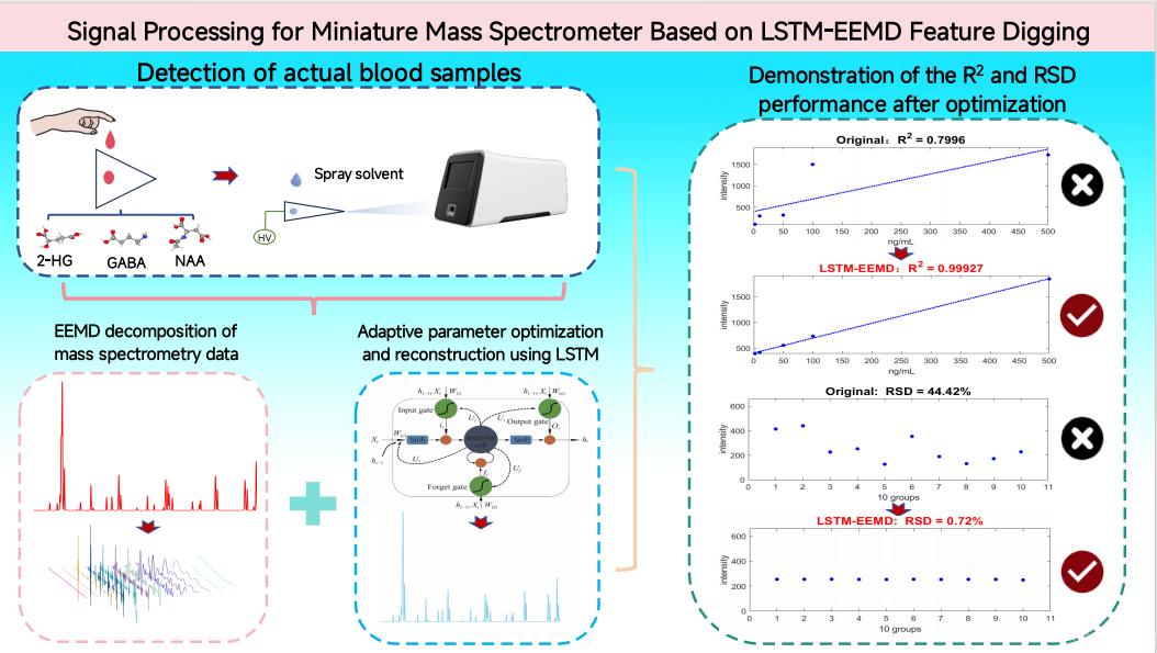 质谱信号是典型的非平稳信号,由于硬件限制和环境条件约束,通常会受到强干扰,这在需要检测复杂基质的应用中是一项重大挑战。传统的数据处理方法在处理此类样本数据方面效果有限,难以完全消除干扰和提高数据质量。本研究针对这一难题,通过深入剖析现有数据处理算法的局限性,提出了一系列创新性的改进策略。研究团队设计了一种新颖的数据优化算法,该算法结合了EEMD 方法可以清晰地分解质谱信号中不同的物理特征分量和LSTM 方法可以自适应地学习信号的内部特征关系的能力,从而显著提升了质谱数据的质量,极大扩展了小型质谱仪在生命科学、生物医药等领域的应用范围。