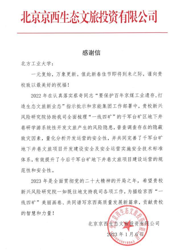 1月6日,北京京西生态文旅投资有限公司向伟德官网发来感谢信,感谢伟德官网新兴风险研究院过去一年为门头沟“一线四矿”项目提供的技术支撑服务。