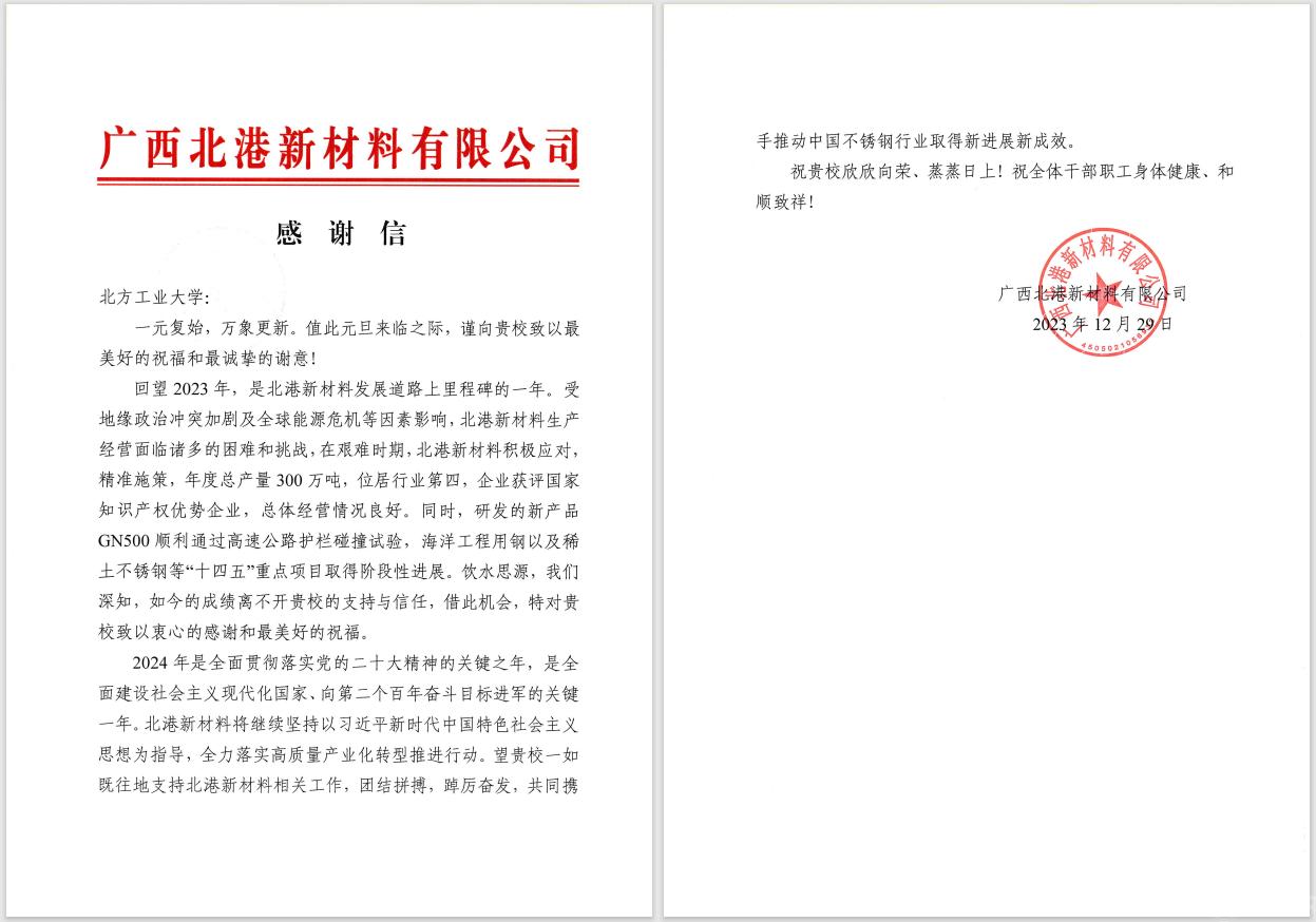 12月29日,伟德官网收到广西北港新材料有限公司发来的感谢信,感谢张立峰校长团队对北港新材料相关工作的支持与帮助。