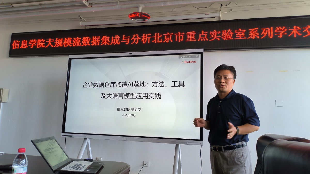 9月20日上午,信息学院大规模流数据集成与分析技术北京市重点实验室邀请了酷克数据首席科学家杨胜文博士进行了题为“企业数据仓库加速AI落地:方法、工具及大语言模型应用实践”的学术报告和交流。本次报告由实验室的王桂玲研究员主持,实验室主任韩燕波教授代表实验室师生对杨胜文博士表示了热烈的欢迎,信息学院七十多位同学参加了此次学术活动。杨胜文博士首先从数据平台技术的演进过程入手,介绍了传统技术中目前存在的问题...