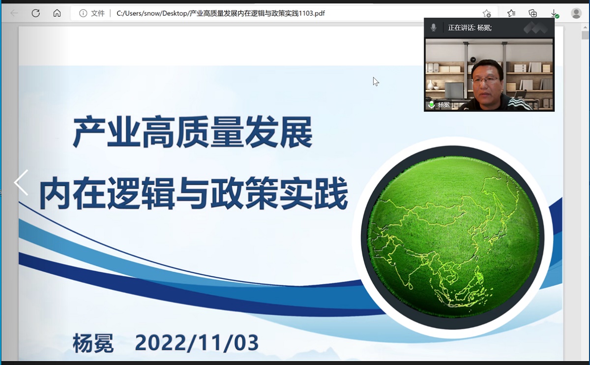 11月3日,经济管理学院“励学讲堂”第3期以腾讯会议形式举行。武汉大学经济与管理学院教授、博士生导师、经济研究所所长、湖北省人文社科重点研究基地——武汉大学人口·资源·环境经济研究中心主任杨冕教授受邀为学院师生开展主题为“产业高质量发展内在逻辑与政策实践”的学术报告。讲座由经管学院郭正权教授主持。杨冕教授重点阐述高质量发展的由来及其本质内涵,通过丰富理论知识向与会师生深刻的阐述了产业高质量发展的核...